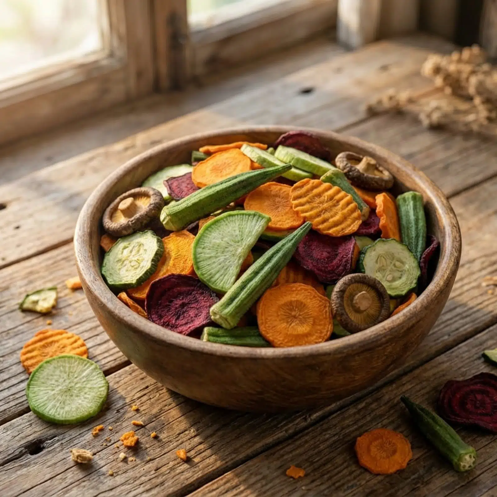 Ehrlicher Geschmack von grünem Rettich, Karotten, Roter Bete, Okra und Pilzen in knuspriger Form