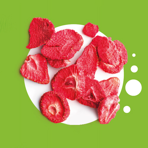 GEFRIERGETROCKNETE ERDBEEREN. Freeze-dried fruit. Zutaten: gefriergetrocknete Erdbeeren 100 %. Kann Spuren von Erdnüssen und Schalenfrüchten enthalten. Nährwerte pro 100 g: Energie 1359 kJ/ 323 kcal; Fett 1,0 g, davon gesättigte Fettsäuren 0 g; Kohlenhydrate 61 g, davon Zucker 44 g; Ballaststoffe 16 g; Eiweiß 5,8 g; Salz 0,01 g.