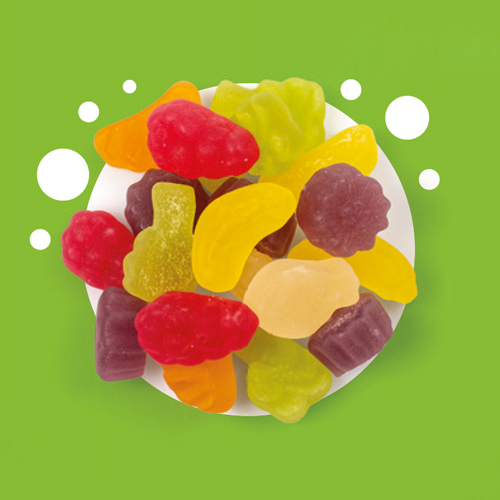 FRUCHTGUMMI-MIX. Gelee mit Fruchtgeschmack. Zutaten: Zucker, Glukosesirup, Wasser, Gelatine, Fruchtsäfte aus Konzentrat 1,2 % (Ananas, Orange, Mandarine, Guave, Aprikose, Mango, Passionsfrucht, Banane, Apfel, Papaya, Limette), Säureregulator: Zitronensäure; Spirulina-Konzentrat, Färberdistelkonzentrat, Schwarzmöhrensaftkonzentrat, Hibiskus- und Karottenkonzentrat, Aromen, Überzugsmittel (Kokosöl, Überzugsmittel: Carnaubawachs). Kann Spuren von Erdnüssen und Schalenfrüchten enthalten. Nährwerte pro 100 g: Energie 1382 kJ/ 325 kcal; Fett 0,2 g, davon gesättigte Fettsäuren 0,2 g; Kohlenhydrate 76 g, davon Zucker 67 g; Ballaststoffe 0 g; Eiweiß 6,0 g; Salz 0,01 g.