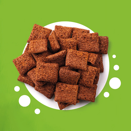 KNUSPERKISSEN SCHOKO-GESCHMACK. Extrudiertes Produkt. Zutaten: Getreide-Extrudat 59 % (Weizenmehl, Maismehl, Zucker, Kakaopulver mit reduziertem Fettgehalt, Haferflocken, Laktose, Weizenkleie, Speisesalz), Füllung 41 % (Zucker, Sheabutter, Molkenpulver, Kakaomasse 5 %, Kartoffelstärke, Kakaopulver mit reduziertem Fettgehalt 1 %, Milchpulver, Emulgatoren: Lecithine; natürliches Vanillearoma). Kann Spuren von Erdnüssen, Schalenfrüchten und Soja enthalten. Nährwerte pro 100 g: Energie 1846 kJ/ 440 kcal; Fett 16 g, davon gesättigte Fettsäuren 5,3 g; Kohlenhydrate 65 g, davon Zucker 36 g; Ballaststoffe 4,4 g; Eiweiß 6,7 g; Salz 1,11 g.