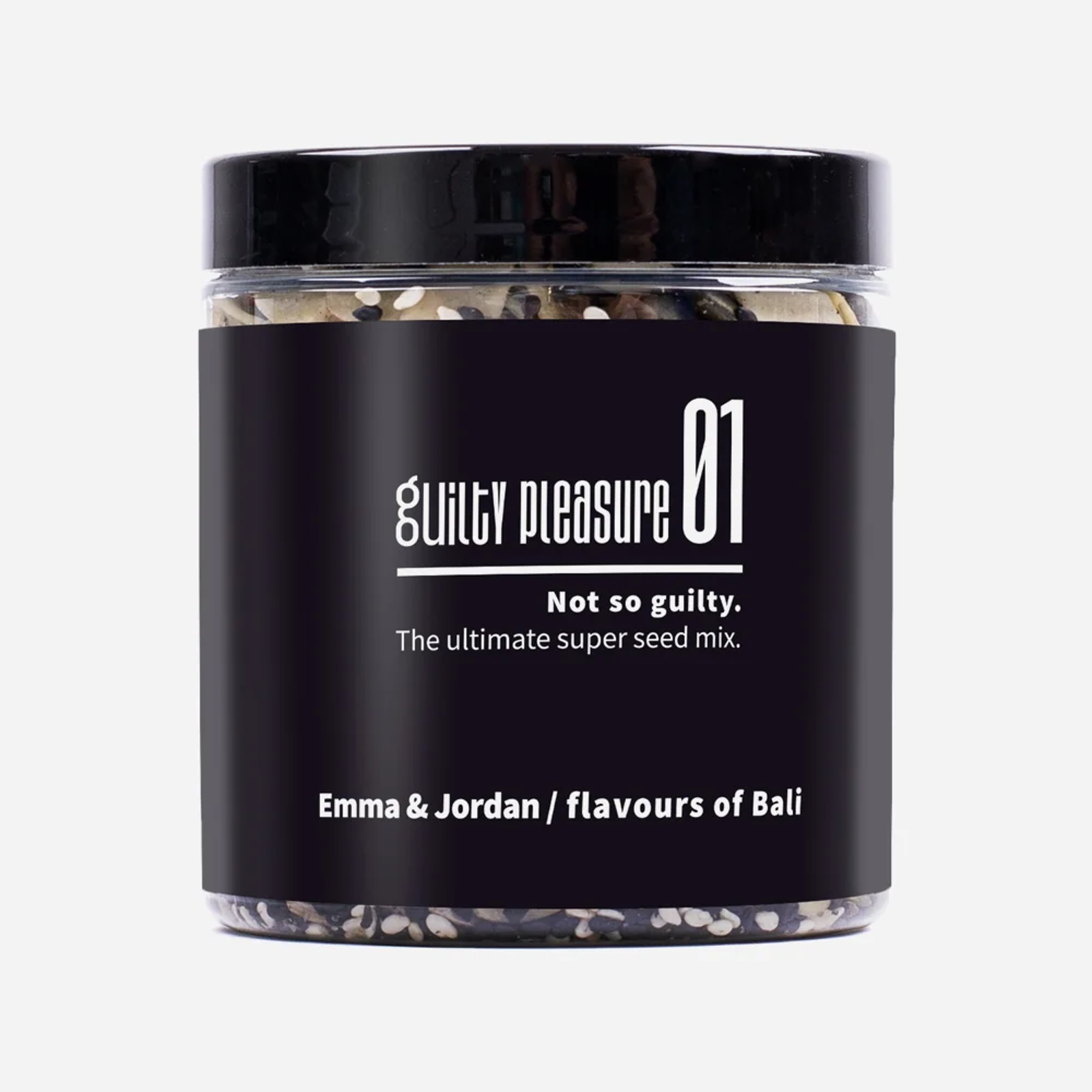 Exotische Freude aus dem fernen Bali! Probieren Sie Guilty pleasure 01, den Samenmix aus der exklusiven Reihe Flavours of Bali von Emma Smetana und Jordan Haj. Wir haben ihn aus schwarzem Sesam, Kürbiskernen, weißem Sesam, Sonnenblumenkernen und Mandelblättchen gemischt.