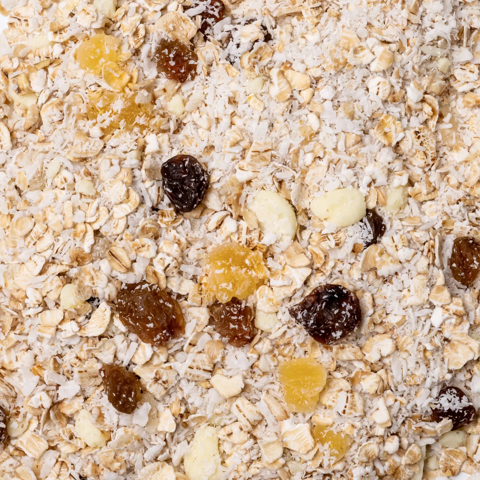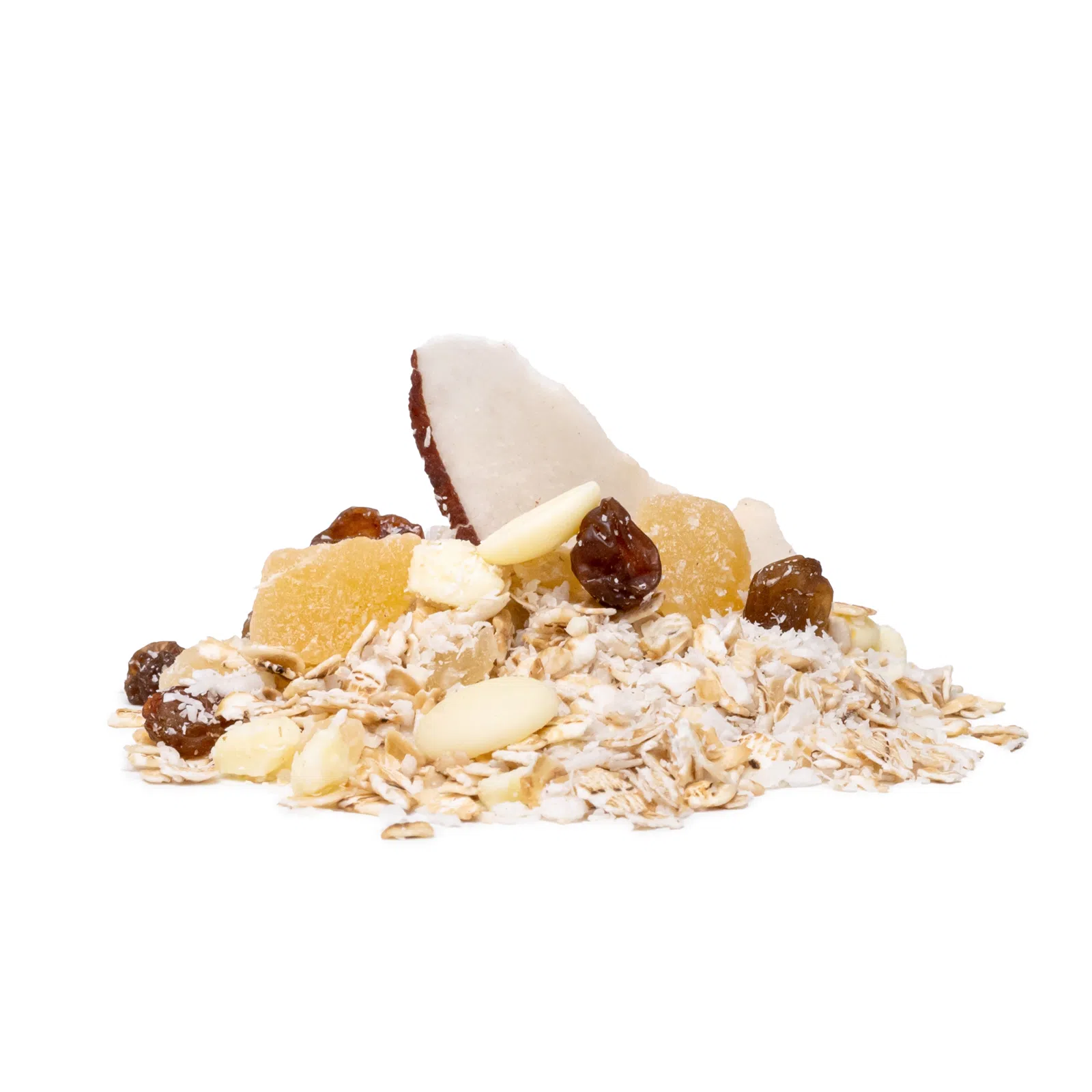 Wie immer – nur gute Zutaten! Ananaswürfel und Kokosraspeln werden kombiniert mit glutenfreien Haferflocken mit Keimlingen, die deutlich besser verdaulich sind als ungekeimtes Getreide. Außerdem findest du belgische weiße Schokolade und saftige Sultaninen im Brei.