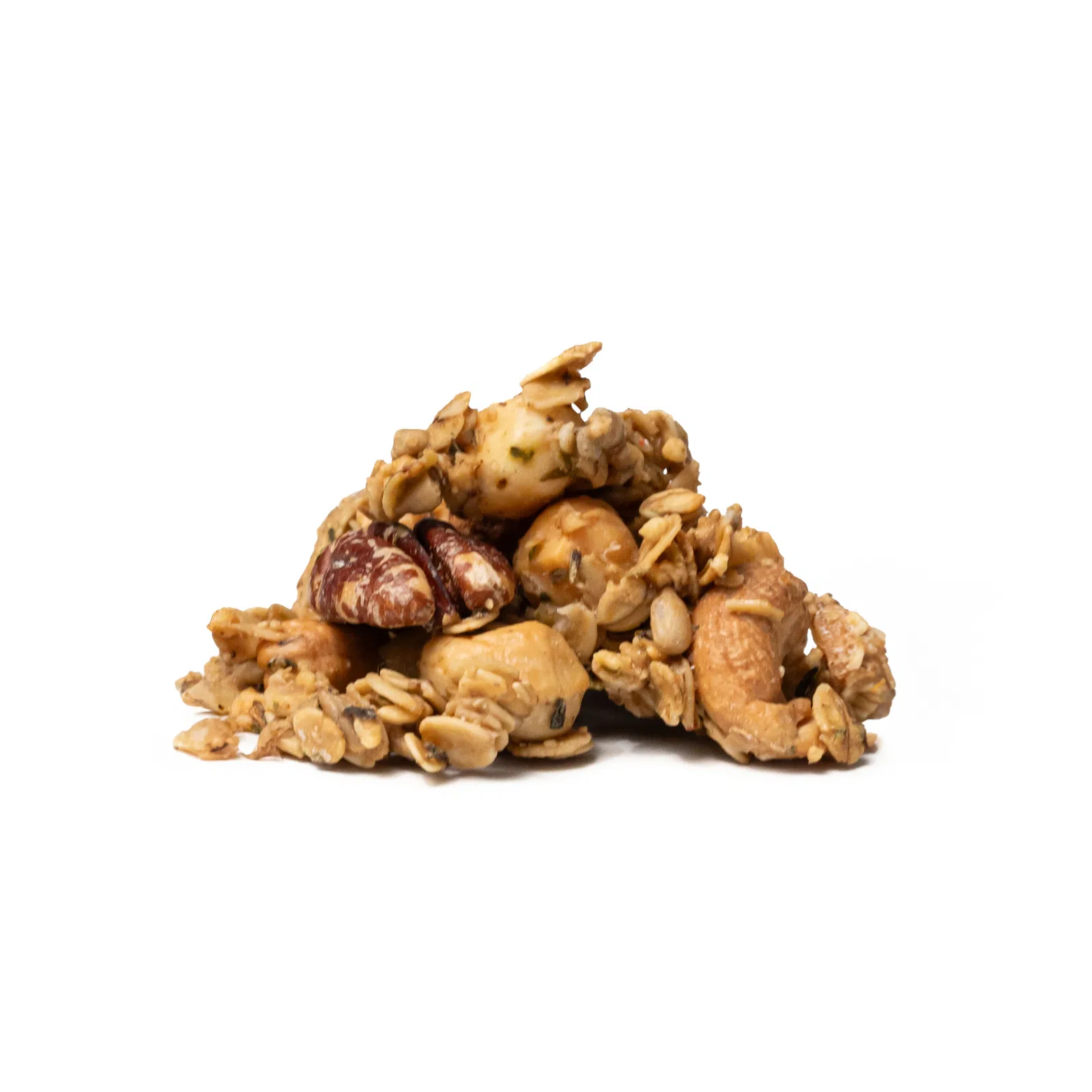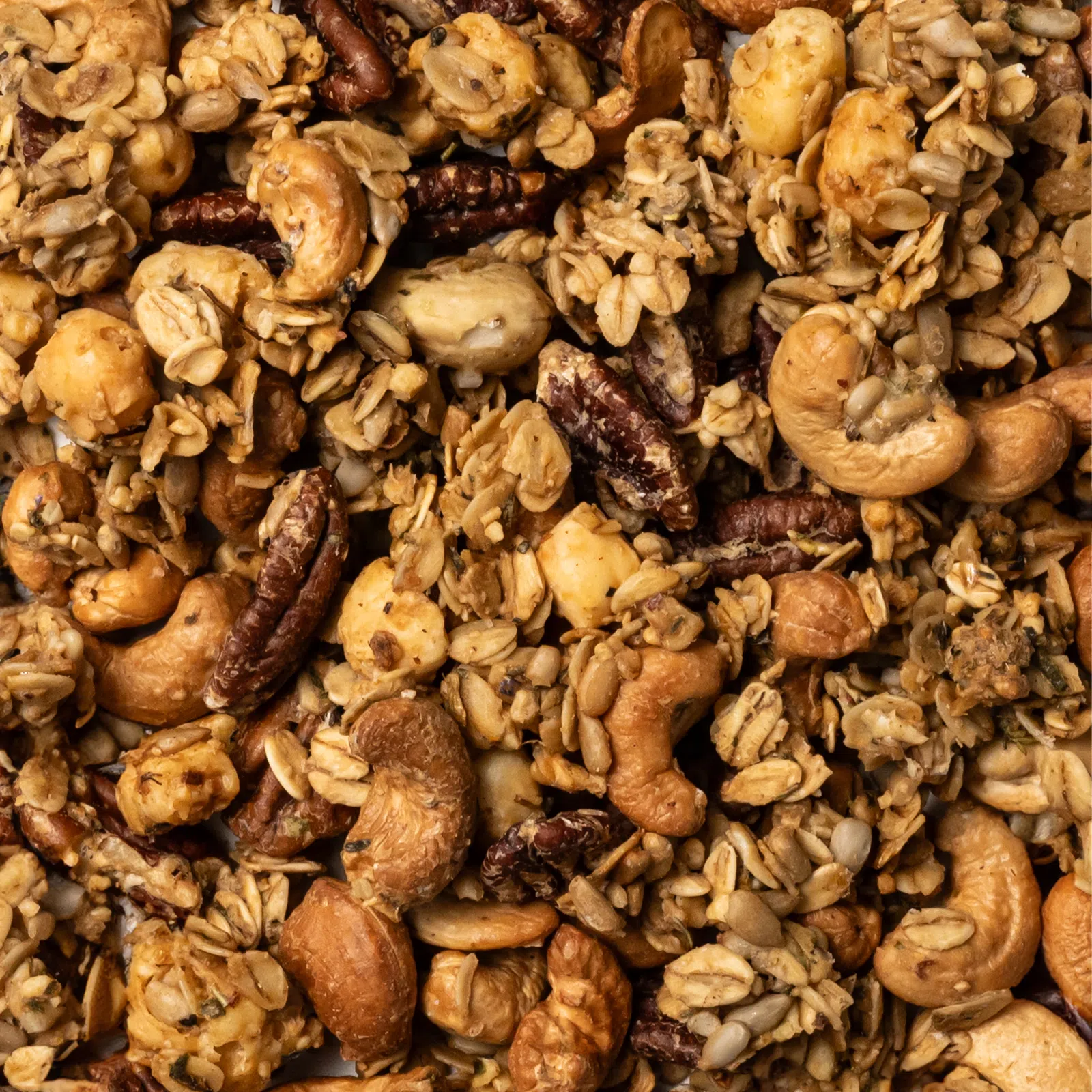 | Zutaten: | glutenfreie Haferflocken 26 %, Cashewkerne 23 %, Pekannüsse 19 %, Sonnenblumenkerne, getrockneter Gouda 8 % (Milch, Salz, Starterkulturen, mikrobielles Lab), getrockneter Cheddar 6 % (Milch, Salz, Starterkulturen, mikrobielles Lab), Trockenhefe, Olivenöl, Himalayasalz, getrocknetes Eiweiß, Gewürzmischung (Meersalz, Knoblauch, Basilikum, Oregano, Bärlauch, Ringelblumenblüten, Rosmarin, Thymian, Rosenblüten, Kornblumenblüten). |
