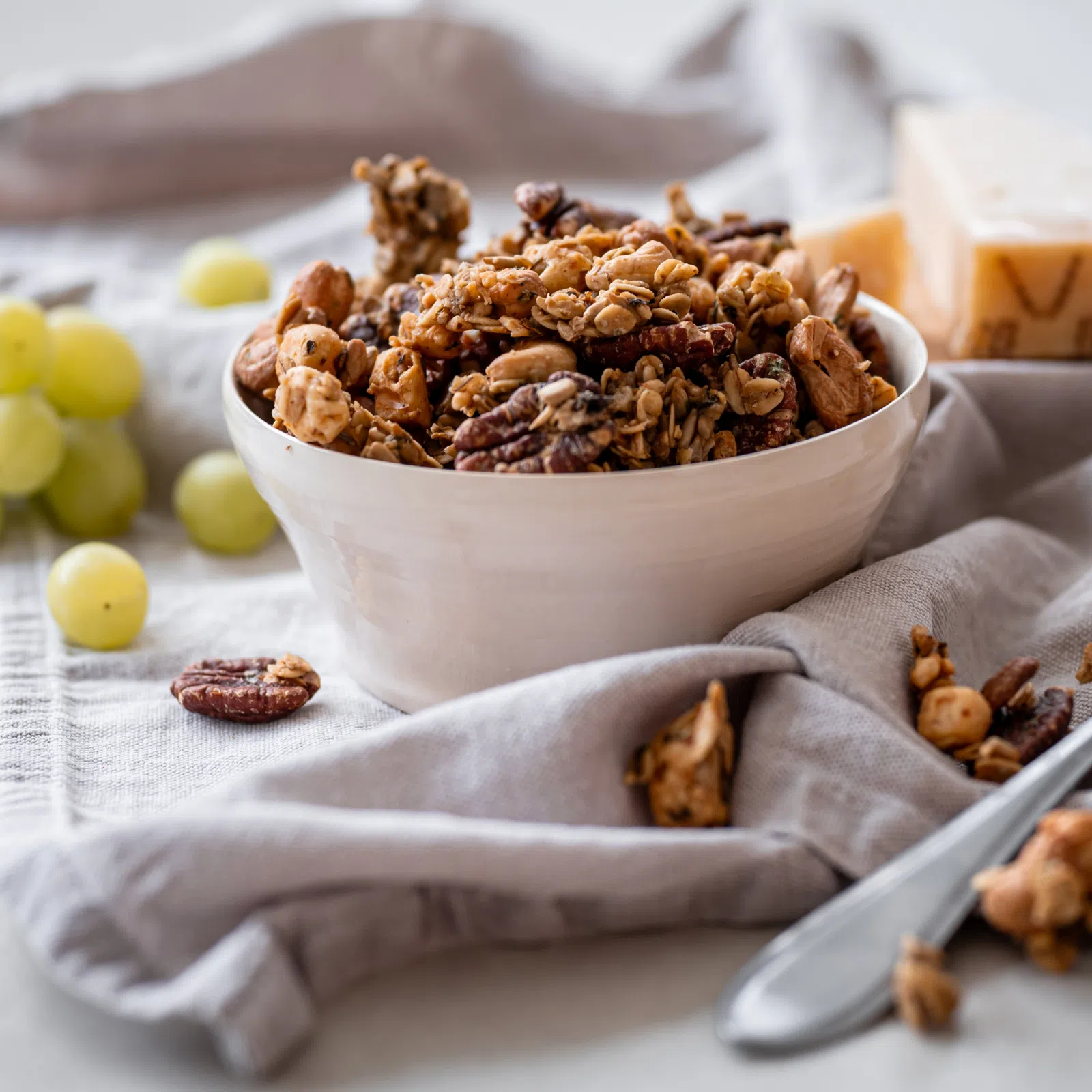Wir haben ihn aus glutenfreien Haferflocken, Cashewkernen, Pekannüssen, Sonnenblumenkernen, getrocknetem Gouda und Cheddar, Olivenöl, einer Prise Himalayasalz und einer Gewürzmischung (u. a. mit Basilikum, Oregano und Bärlauch) zusammengestellt. Dann gebacken – und fertig! Ein rundum knuspriger Käsemix mit Nüssen. Uns schmeckt’s – dir sicher auch. Und das Beste: ohne Zucker und Gluten. Worauf wartest du noch?