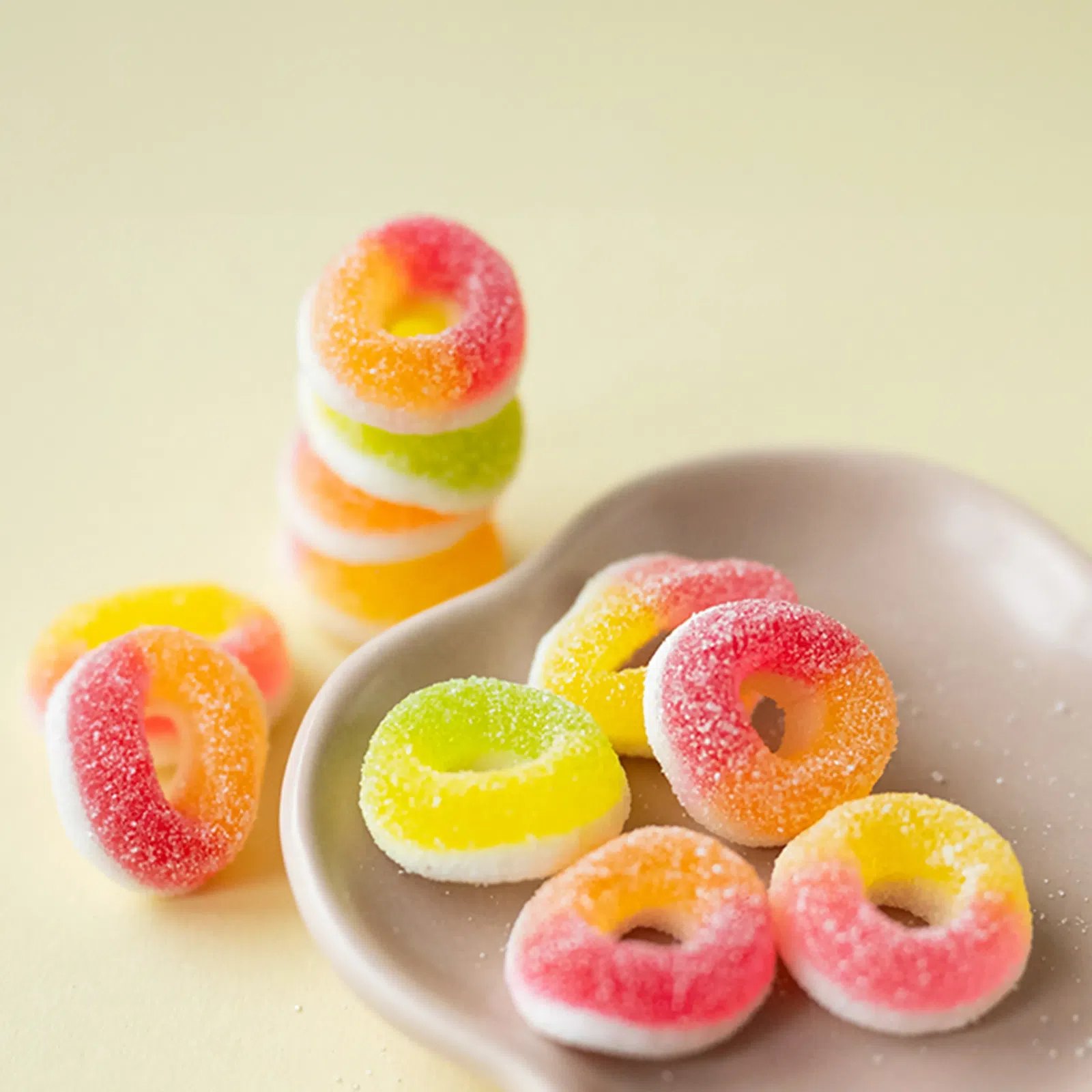 Manchmal hat man Lust auf etwas anderes als Süßes – völlig okay! Statt Süßigkeiten darf es auch mal etwas Saureres sein. Wie wär’s? Diese Fruchtgummis stillen die Lust perfekt. Die Ringe kombinieren Fruchtgummi und Schaum und sind zusätzlich mit saurem Zucker bestreut – für eine ideale Balance der Geschmäcker. Freu dich auf sechs fruchtige Sorten: Ananas, Apfel, Kirsche, Orange, Himbeere und Zitrone.